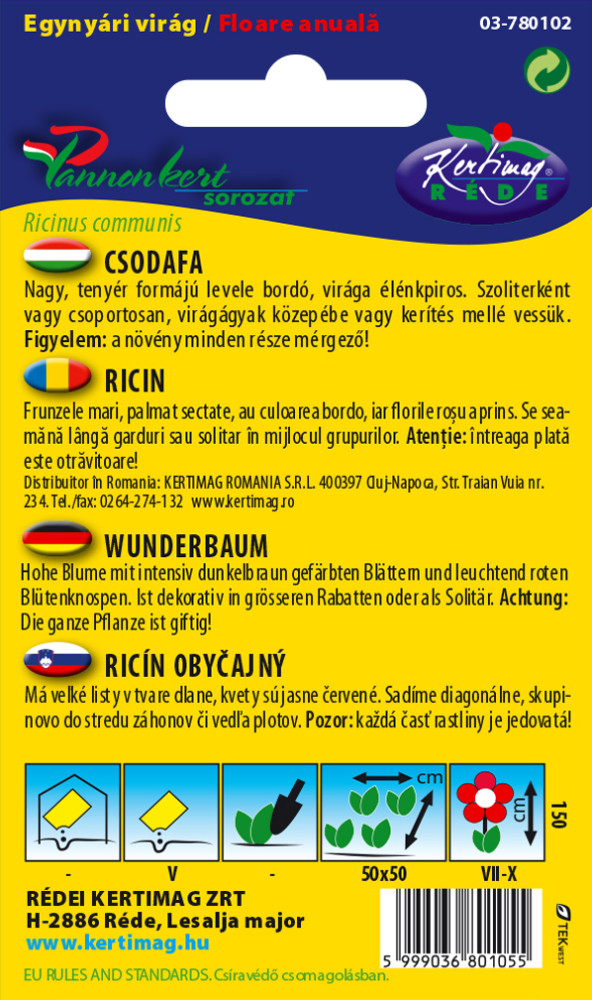 Elsősorban színes, osztott nagyméretű leveleivel díszít. A levél bordó fürtös virágai jelentéktelenek, sárgák, termése tüskés tok, ami pirosra színeződik. Magja erősen mérgező! Mélyrétegű, tápanyagban gazdag talajban, öntözve hatalmas, termetűre fejlődik. Nagyobb gyepfelületekbe csoportosan vagy egyenként ültethetjük, falak, járdák, kerítések mellett cserjepótlónak, takarónövénynek is kiváló.