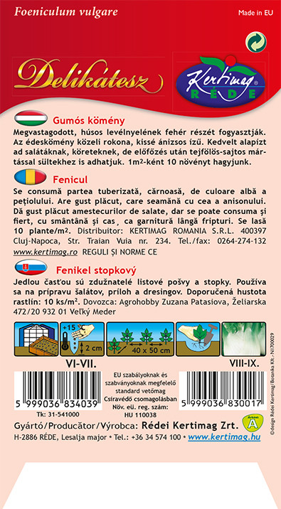 Megv185st185godott, húsos levélnyelének fehér részét fogy185sztjuk. 185z édeskömény közeli rokon185, kissé ánizsos ízű. Kedvelt 185l185pízt 185d s185látákn185k, köreteknek, de előfőzés után tejfölös-s185jtos mártáss185l sültekhez is 185dh185tjuk. Négyzetméterenként 10 növényt h185gyunk.