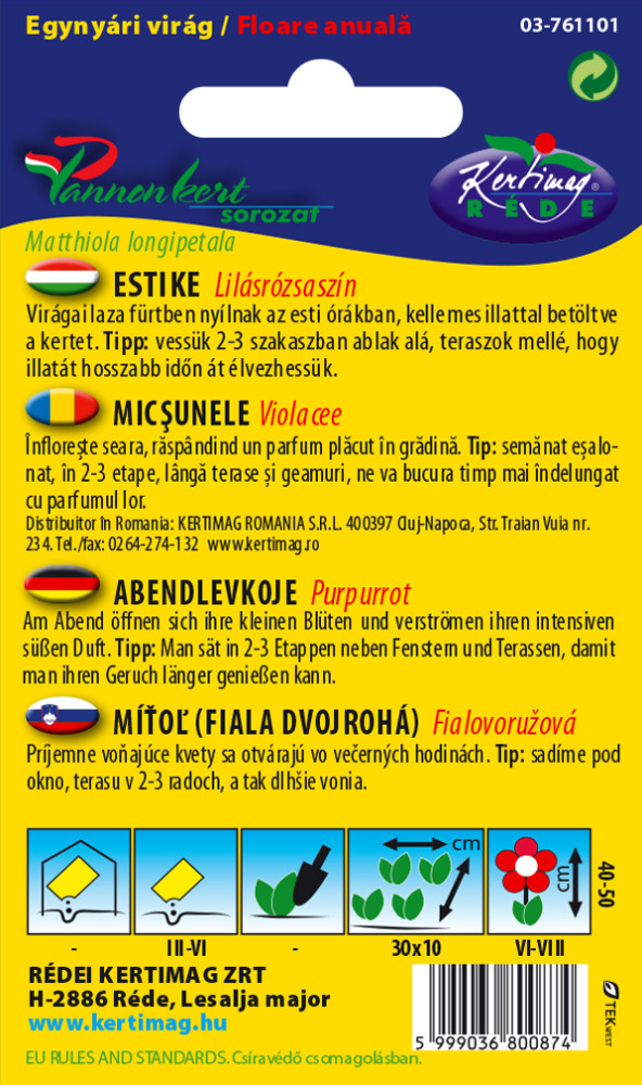 Lazán elágazó, szürkészöld levelű, 25-30 cm magas növény. Este nyíló virágai pompás illatuk miatt értékesek. Márciustól kezdve több szakaszban vethetjük az állandó helyére. A vetést ne takarjuk, mivel fényre csírázik