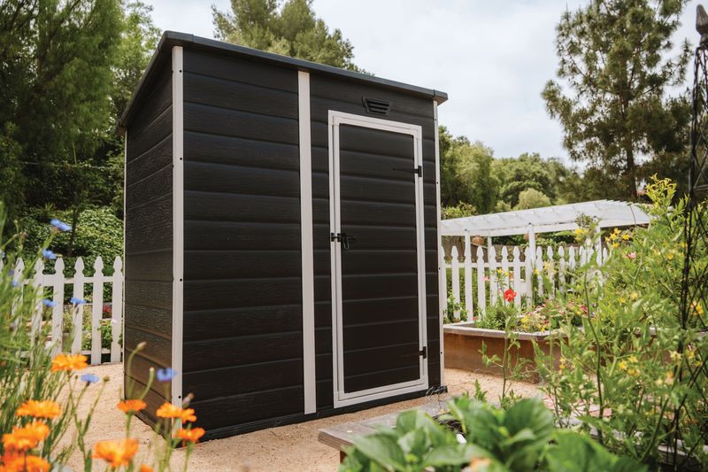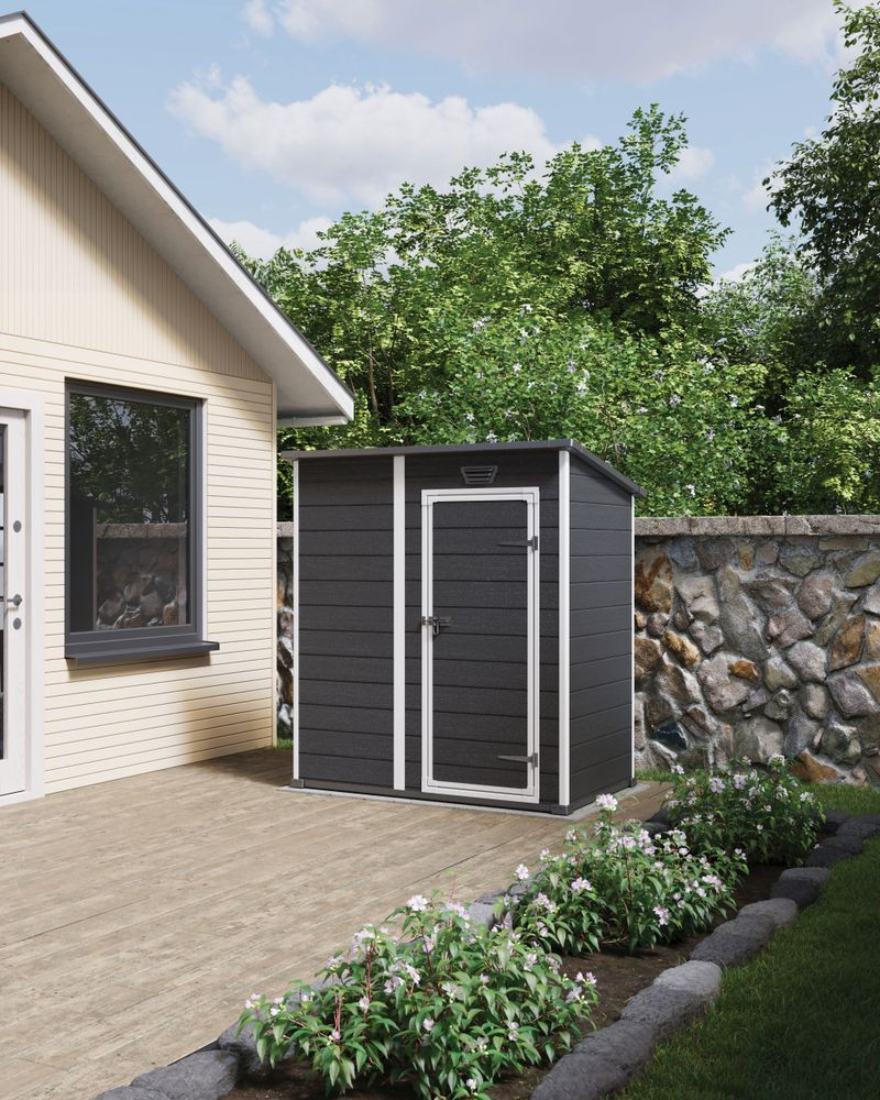 Keter ESSENTIAL 6x4 kerti ház elegáns sötétszürke kivitelben praktikus megoldás kerti szerszámok, kisebb felszerelések és kiegészítők tárolására, amelyeket mindig kéznél szeretne tudni, miközben védve vannak a kedvezőtlen időjárástól. Kompakt méreteinek köszönhetően ideális kisebb kertekbe, teraszokra vagy családi házak udvarára is.