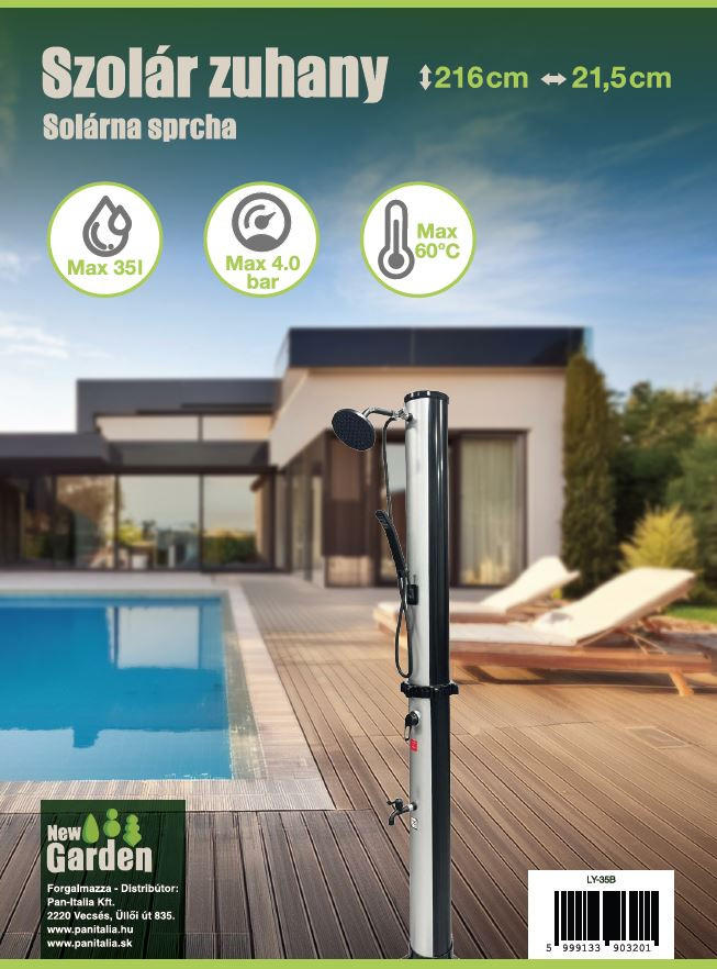 A nap által felmelegített Kerti Zuhanyzó a szolár energiát kihasználva lehetősége van hideg-meleg vizes zuhanyzásra kint a kertjében. A zuhanyzó test 35 liter kapacitású. A zuhanyzóhoz van egy nagy zuhanyrózsa és egy (állítható) lábmosó csap valamint hideg-meleg keverő kar. Színe a szolár felvétel végett fekete. Exkluzív megjelenés a kertben illetve a medence mellet. Kuplungcsatlakozójához tudja a tömlőt csatlakoztatni. Minden tartozéka fekete színű.