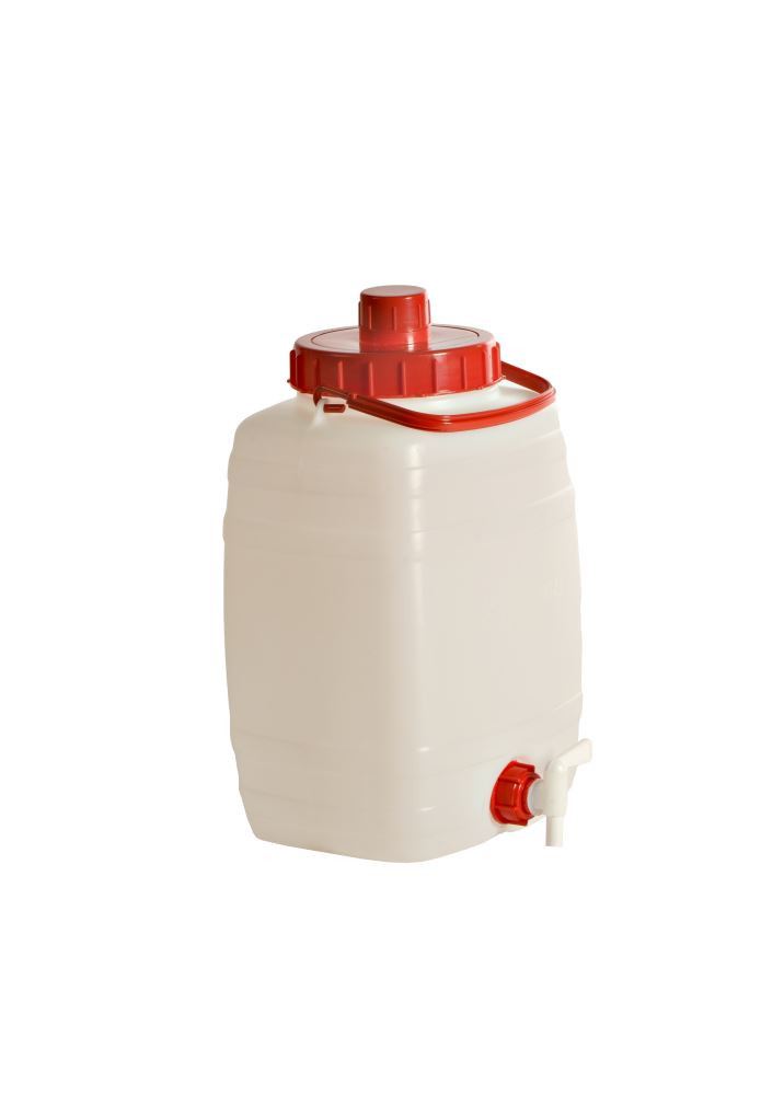 Műanyag fehér hordó csappal, és  zárókupakkal. A kanna tetejét menetes kupakkal tudj zárni.
