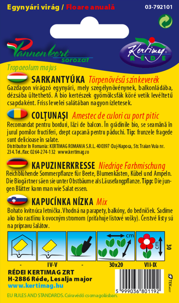 Élénk színű, sarkantyús virágai mellett sajátságos, pajzs alakú levelei is feltűnnek. Elfekvő száron hozza hosszú, csavarodott levélnyelét, levele kerekded, matt színű. Virágai 4-6 cm átmérőjűek, sárga - bordó színben nyílnak, enyhén illatosak. Legszebben félárnyékos, párás, védett helyen fejlődik. Napos fekvésben rendszeres öntözést kíván.
