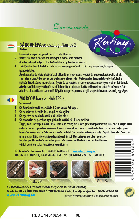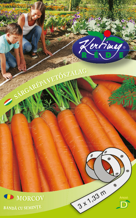 Vetőszalag használatával elkerüljük a ritkítás fáradtságos munkálatát. Gyors és egyszerű a veteményezés, a növények jobban fejlődnek, a felhasznált környezetbarát papír lebomlik a talajban. Fajtajellemzők: korai és másodvetésre alkalmas kiváló Nanti szelekció. Répája hengeres, tompa végű, szép sötétnarancs színű, egységes.